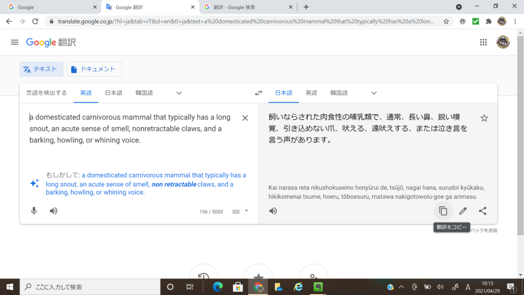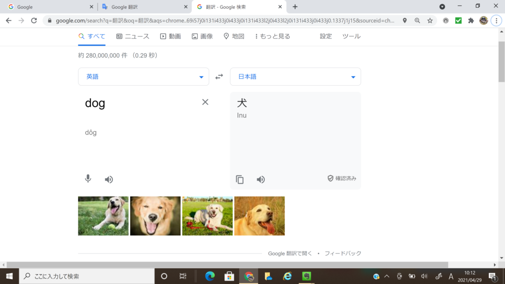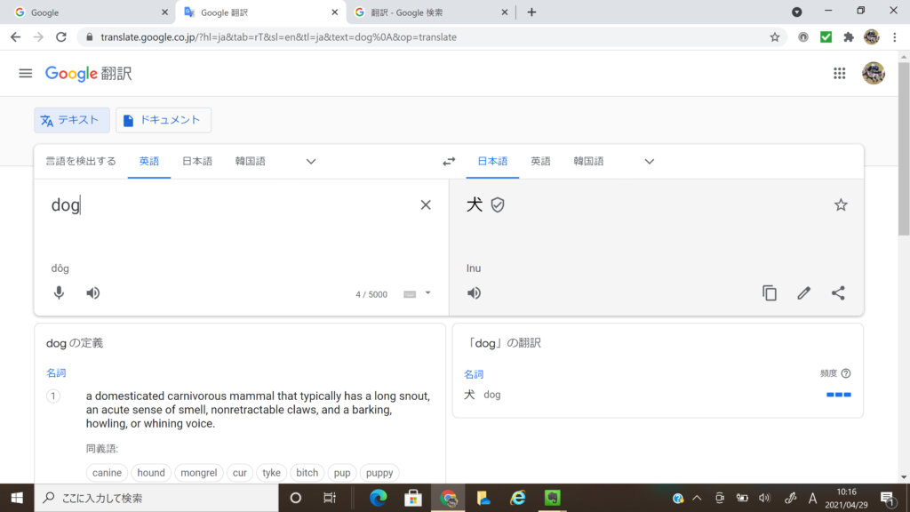 Googleの検索画面に入って、「dog」とテキスト入力すれば、「犬」の訳語と犬の写真が表示されます。Googleアプリの翻訳機能だと、英語による定義説明が加わります。ここでは音声再生ができるのはもちろんのこと、英文を日本語訳に変換してくれることだって出来ます。