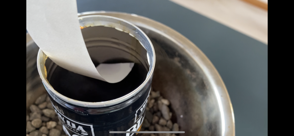 後半はうがい薬を使った指紋の検出です。砂皿の上にスチール缶を置いて3分程度加熱したら、うがい薬を加えます。