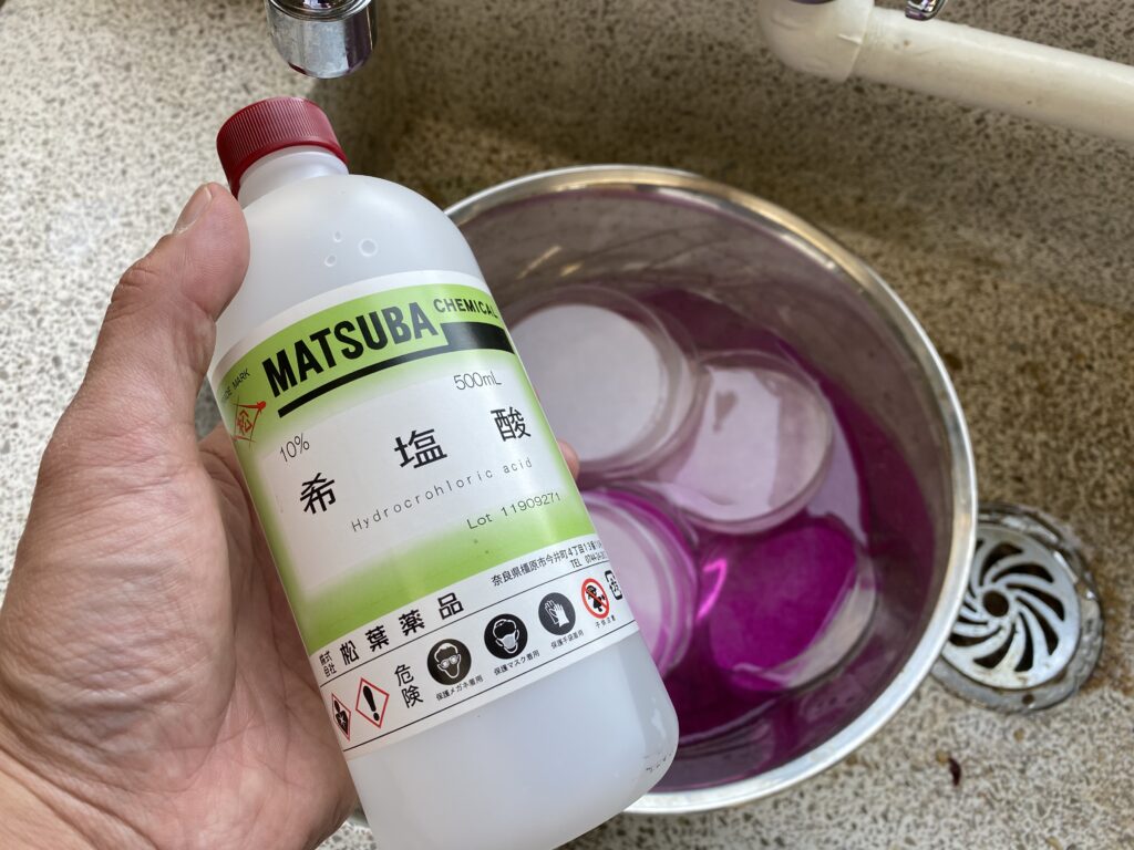 アルカリ金属と反応した器具は水につけて、塩酸で中和しておきます。