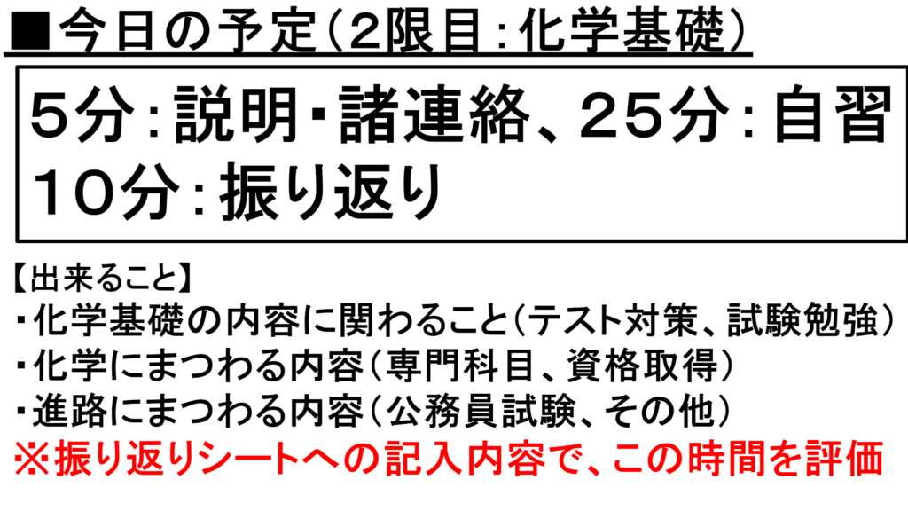 中間考査の出題範囲となる授業資料は第1回目の授業の時に配布しており、該当範囲の解説は動画化しているので、わざわざ授業で解説しません。40名の生徒に対して、特定の内容を解説しようとすると、生徒たちの学力からモチベーションの差であったり、生徒たちのその日の体調によって、定着度にばらつきが出てしまうので超非効率です。