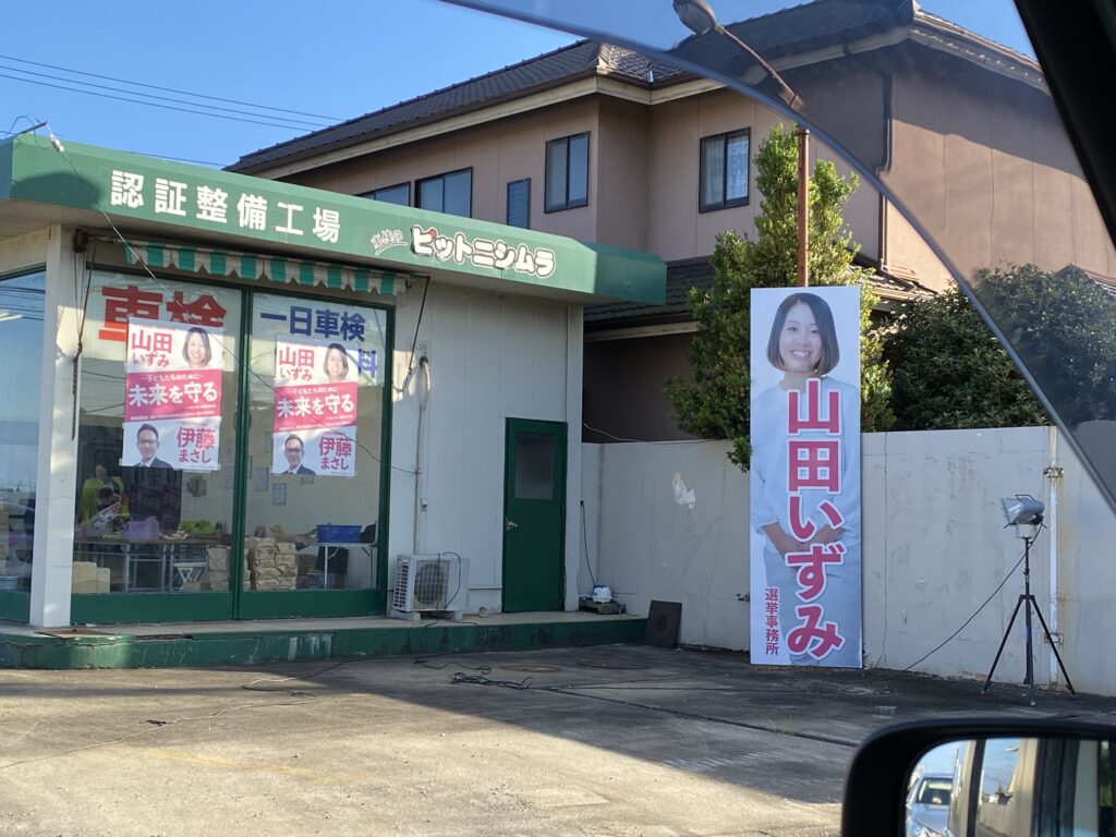 帰りの道中、山田いずみさんの選挙事務所を見かけたので、信号待ちの時に写真撮影しました。