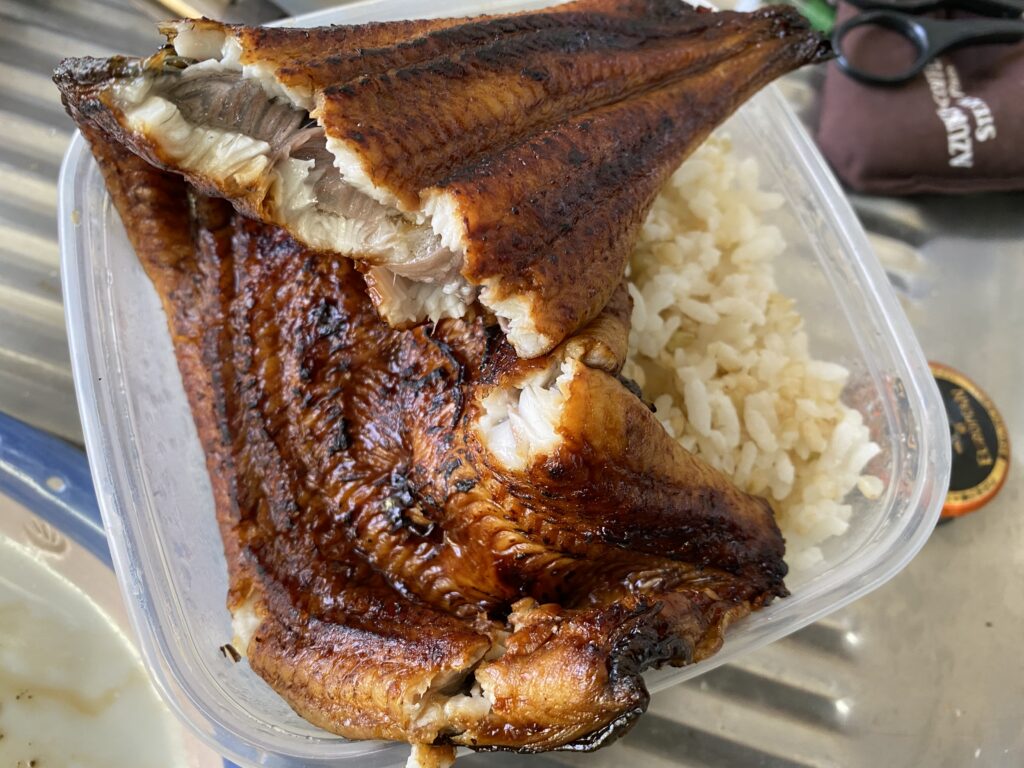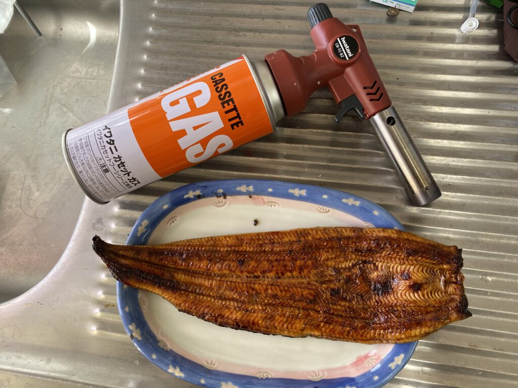 鰻1匹分を、実験室にあるレンジで温めてからバーナーでこんがり香ばしく炙ってからいただきます。