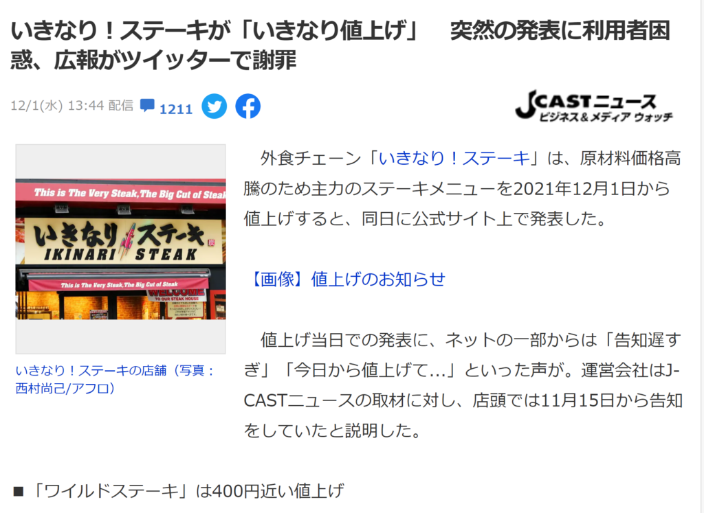 いきなりステーキが12月から突然値上げに踏み切ったようです。